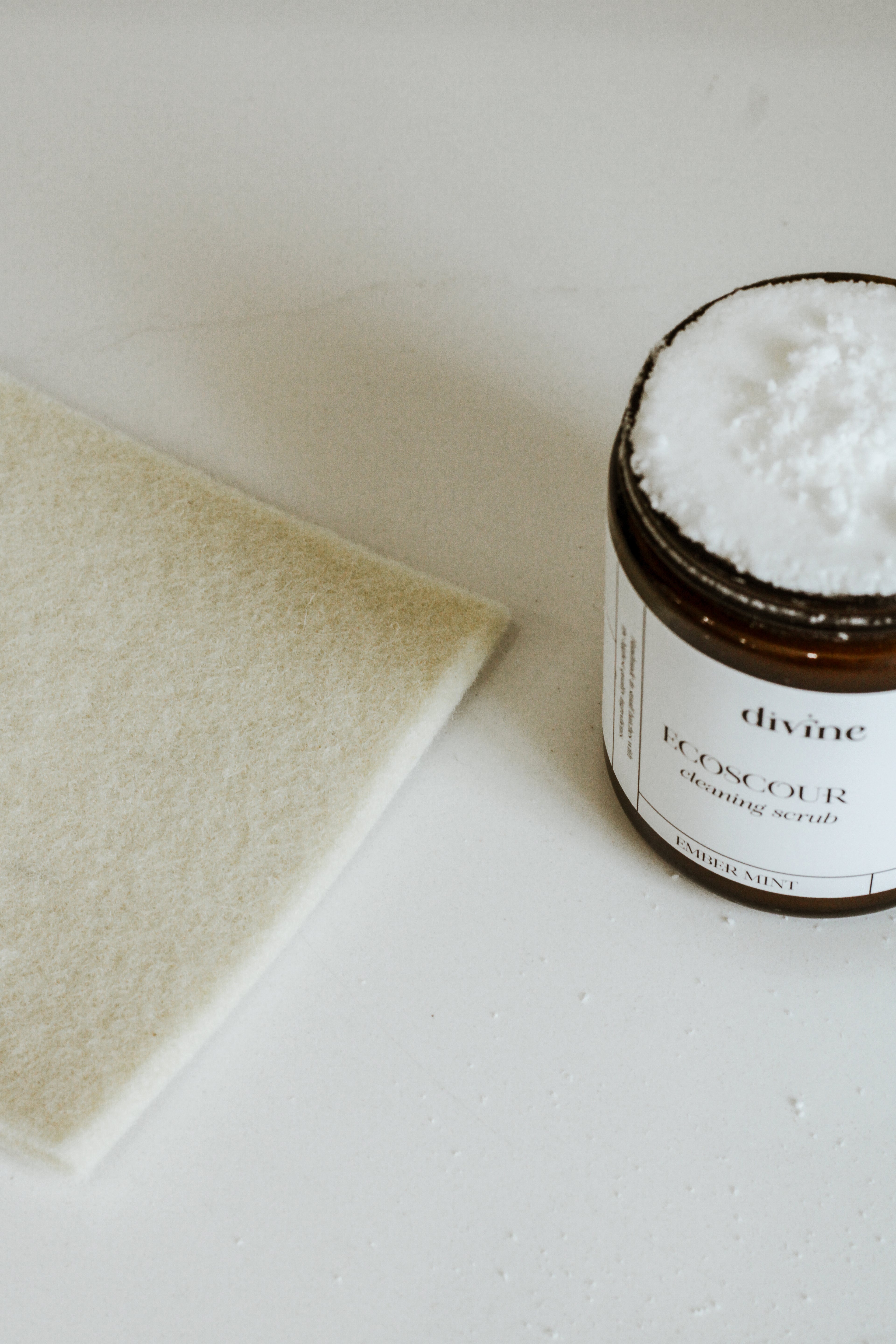 Lightly sprinkle onto the surface, then scrub clean with our Divine Wool Scrub, a damp cloth or sponge.